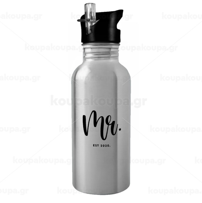 Mr & Mrs (Mr), Water bottle Silver with straw, stainless steel 600ml