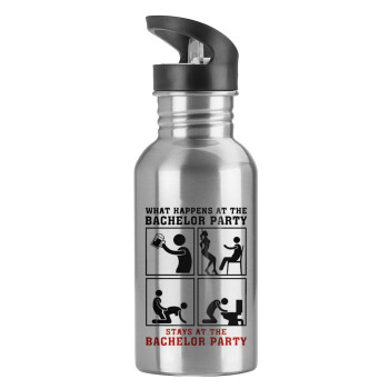 What happens at the bachelor party, stays at the bachelor party!, Water bottle Silver with straw, stainless steel 600ml
