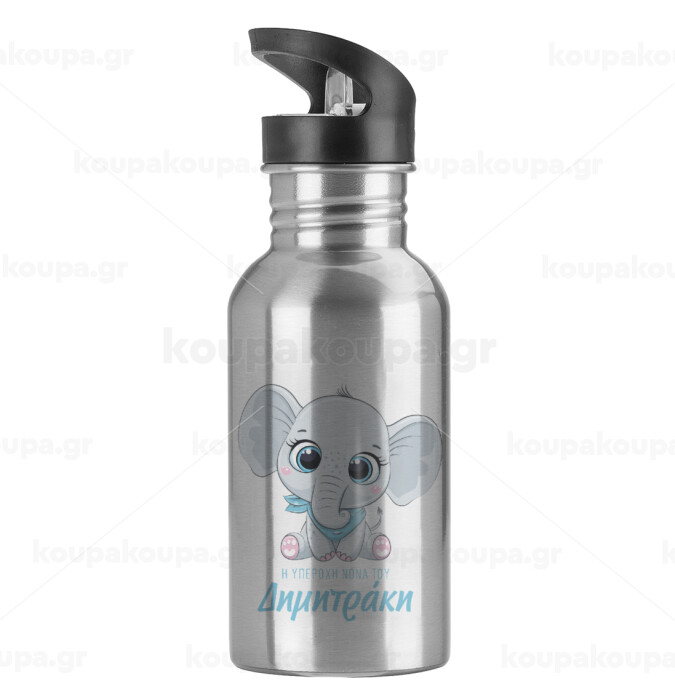 Η νονά μου, ελεφαντάκι γαλάζιο, Water bottle Silver with straw, stainless steel 600ml