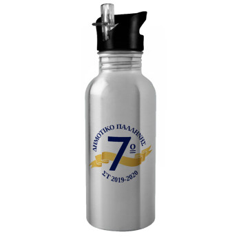 Σχολική μπλε με κορδέλα, Water bottle Silver with straw, stainless steel 600ml