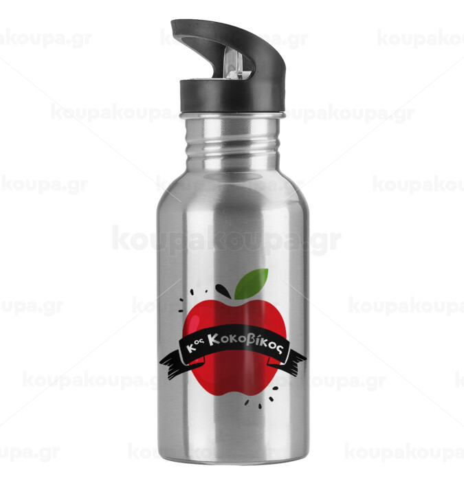 Αναμνηστικό Δώρο Δασκάλου Κόκκινο Μήλο, Water bottle Silver with straw, stainless steel 600ml