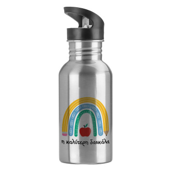 Η καλύτερη δασκάλα, Water bottle Silver with straw, stainless steel 600ml