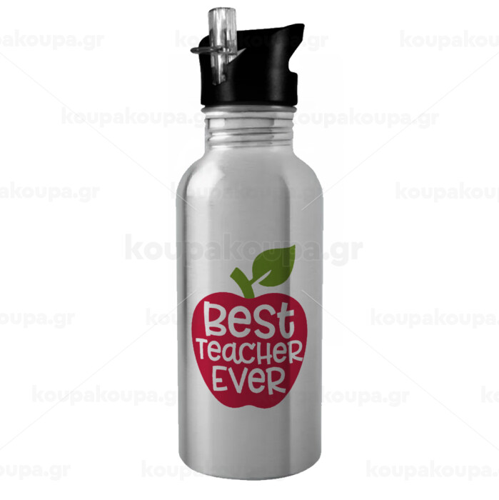 best teacher ever, apple!, Water bottle Silver with straw, stainless steel 600ml