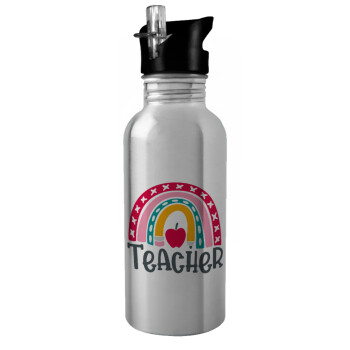 Rainbow teacher, Water bottle Silver with straw, stainless steel 600ml