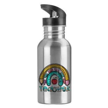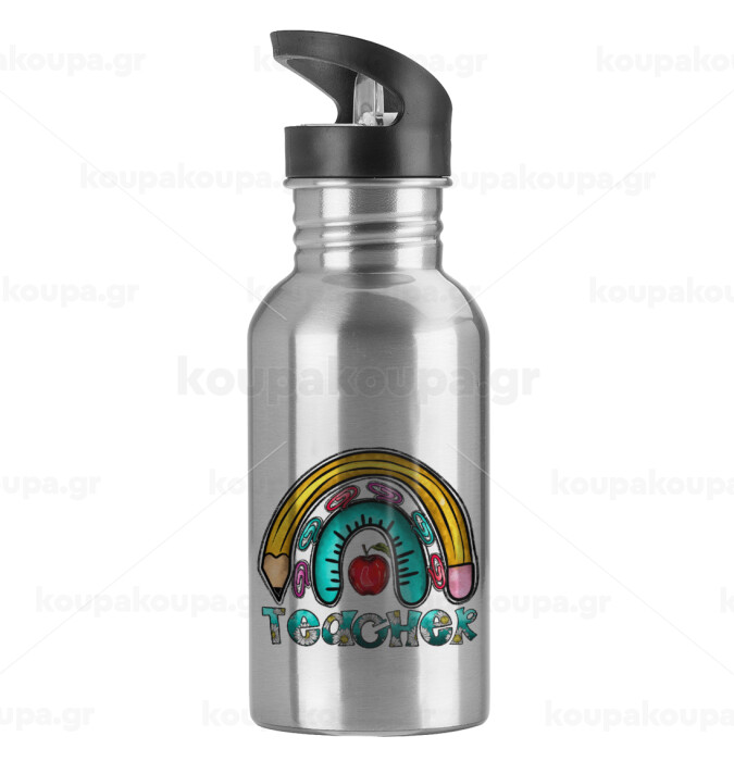 Teacher, Water bottle Silver with straw, stainless steel 600ml