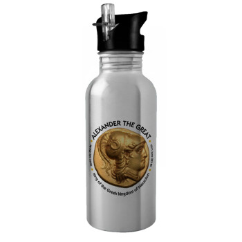 Alexander the Great, Water bottle Silver with straw, stainless steel 600ml