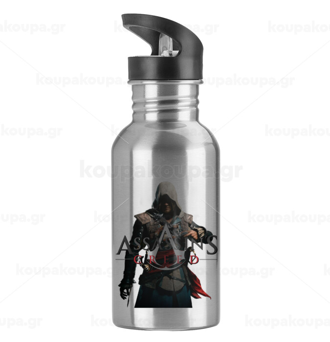 Assassin's Creed, Water bottle Silver with straw, stainless steel 600ml