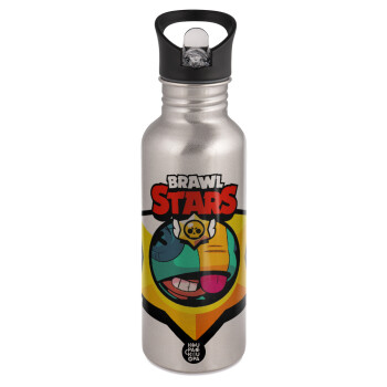 Brawl Stars Leon, Water bottle Silver with straw, stainless steel 600ml