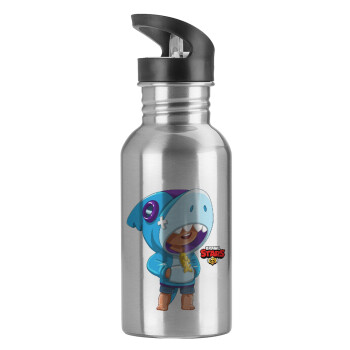 Brawl Stars Leon Shark, Water bottle Silver with straw, stainless steel 600ml