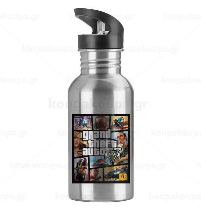 GTA V, Water bottle Silver with straw, stainless steel 600ml