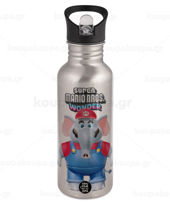 Super mario wonder, Water bottle Silver with straw, stainless steel 600ml