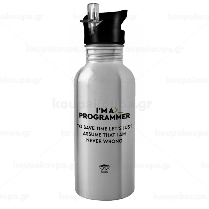I’m a programmer Save time, Water bottle Silver with straw, stainless steel 600ml