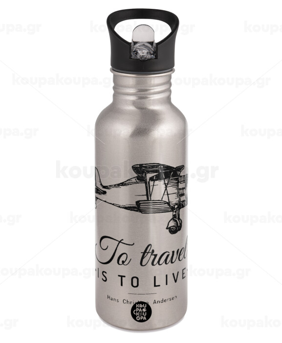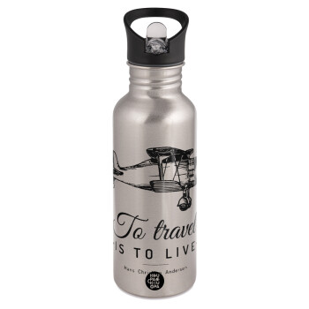 To travel is to live, Water bottle Silver with straw, stainless steel 600ml