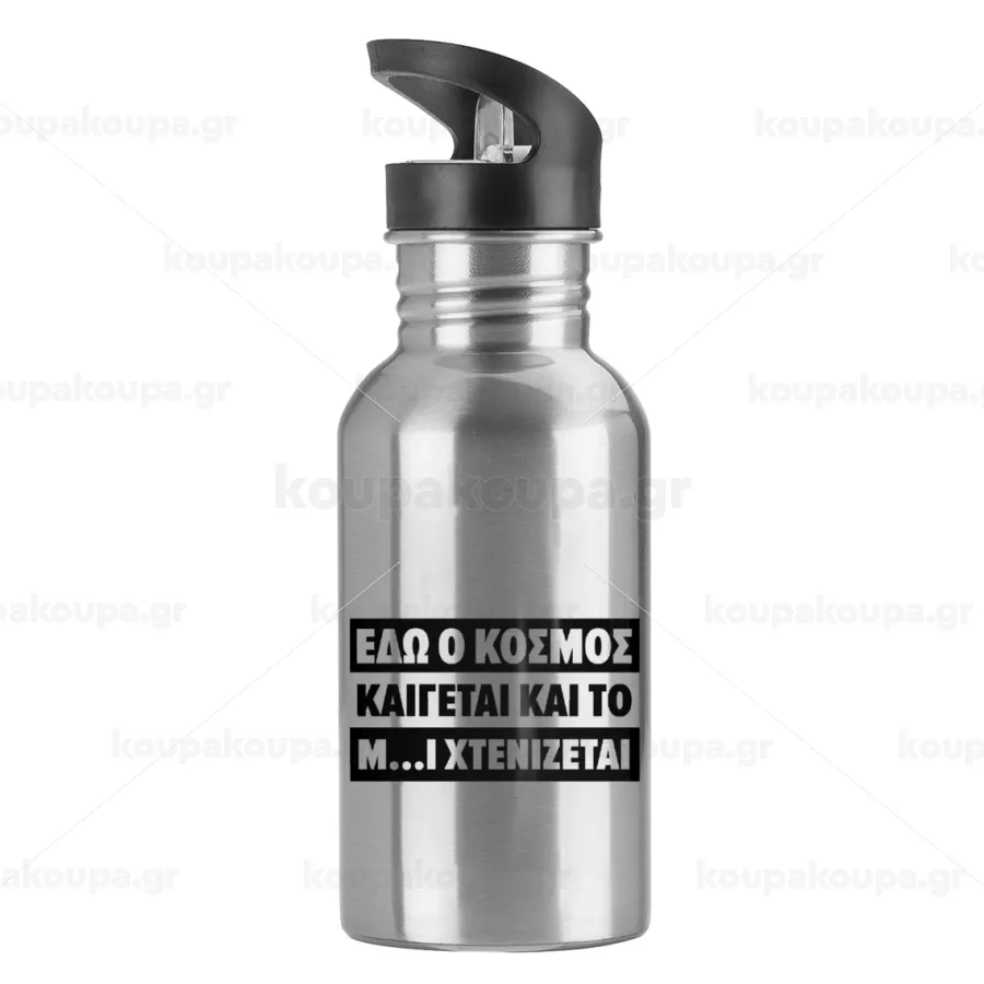 Εδώ ο κόσμος καίγεται και το Μ....Ι χτενίζεται, Water bottle Silver with straw, stainless steel 600ml