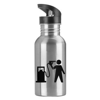 Fuel crisis, Water bottle Silver with straw, stainless steel 600ml