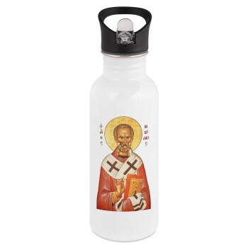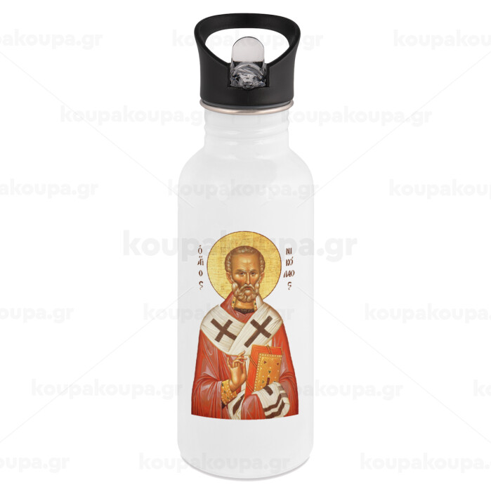 Saint Nicholas orthodox , White water bottle with straw, stainless steel 600ml