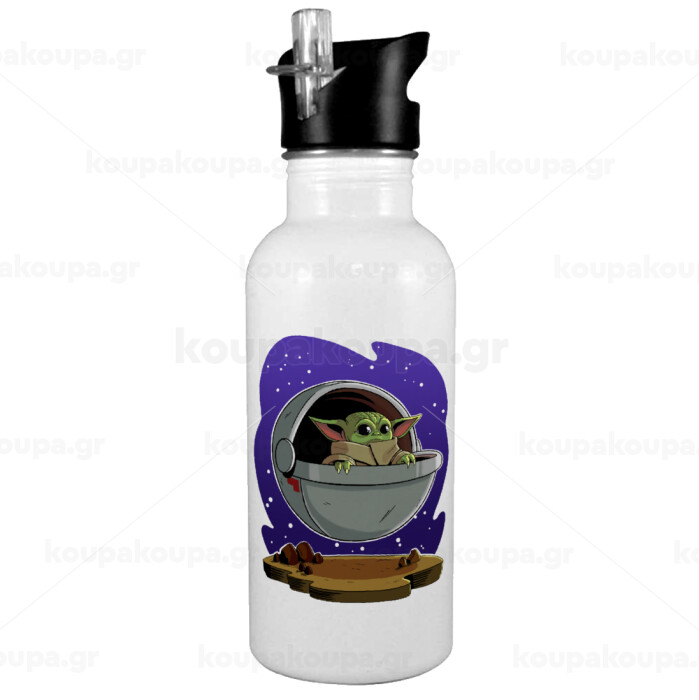 Baby Yoda mandalorian, White water bottle with straw, stainless steel 600ml
