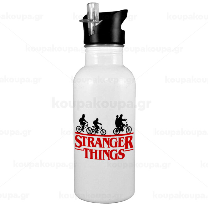 Stranger Things red, White water bottle with straw, stainless steel 600ml