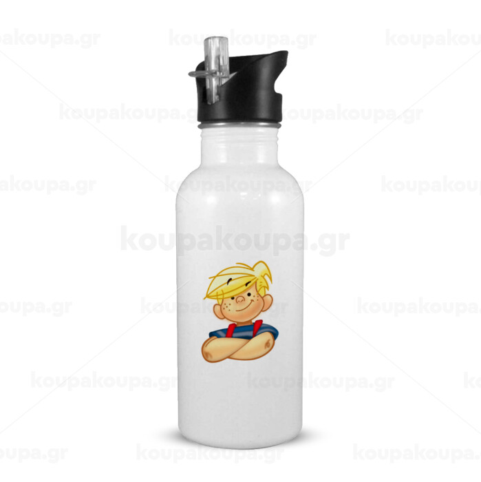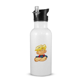 Dennis the Menace, White water bottle with straw, stainless steel 600ml
