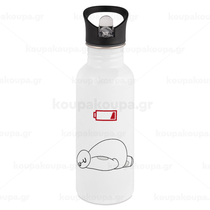 Baymax battery low, White water bottle with straw, stainless steel 600ml