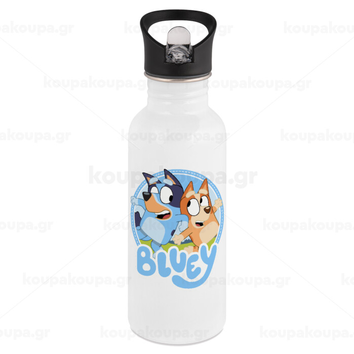 Μπλε, White water bottle with straw, stainless steel 600ml