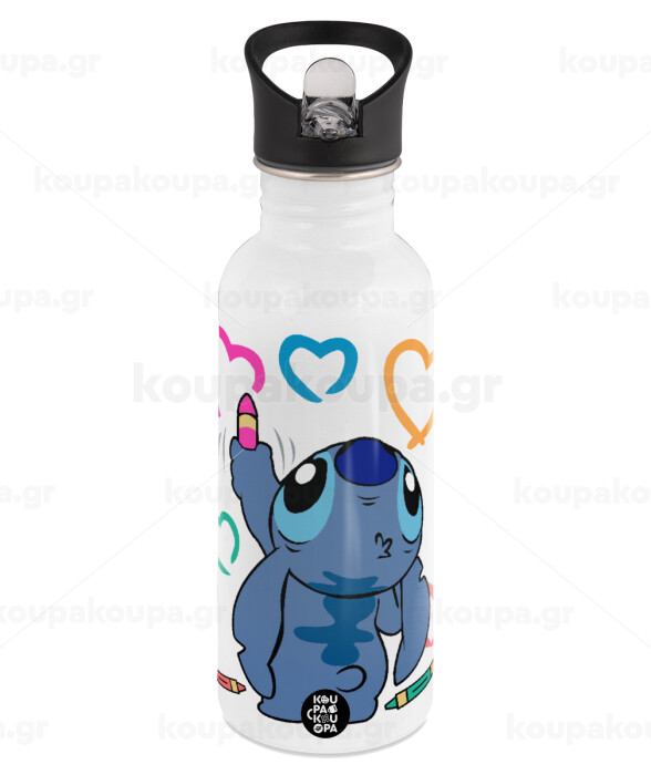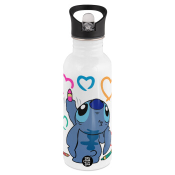 Lilo & Stitch painting, White water bottle with straw, stainless steel 600ml