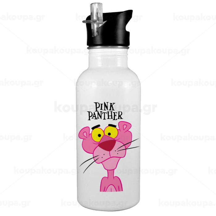 Pink Panther cartoon, White water bottle with straw, stainless steel 600ml