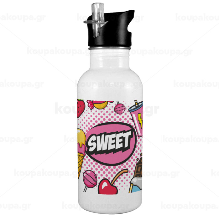 Bottle made of (stainless steel) 600ml with colorful high-quality printing with vivid colors and durability over time. Straw top lid. Hand wash recommended. Suitable for children.