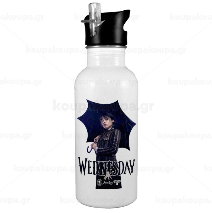 Wednesday rain, White water bottle with straw, stainless steel 600ml