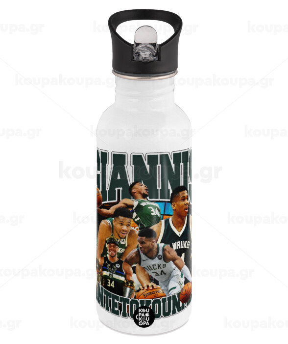 Giannis Antetokounmpo, White water bottle with straw, stainless steel 600ml