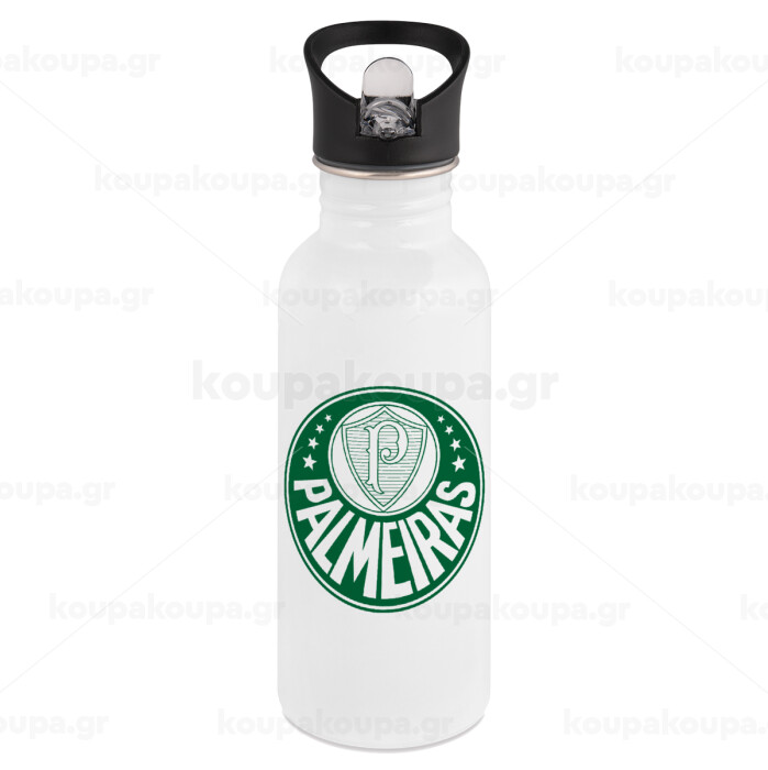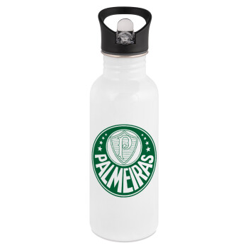 Palmeiras, White water bottle with straw, stainless steel 600ml