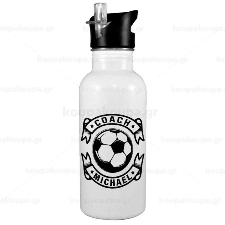 Soccer coach, White water bottle with straw, stainless steel 600ml