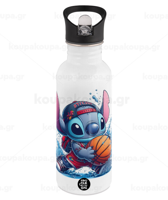 Stitch Basketball, White water bottle with straw, stainless steel 600ml