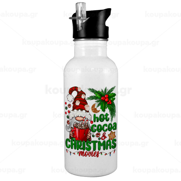 Hot cocoa and Christmas movies, White water bottle with straw, stainless steel 600ml
