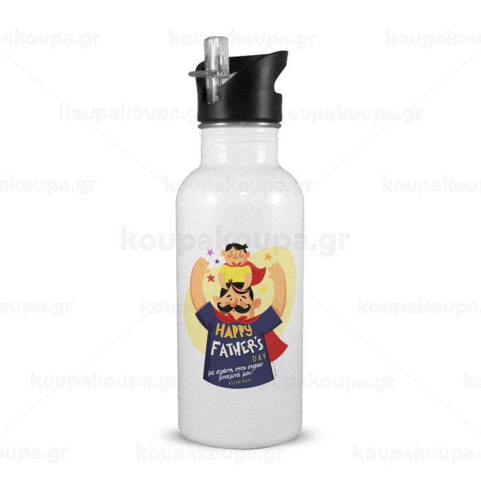 Happy Fathers Day με όνομα, White water bottle with straw, stainless steel 600ml