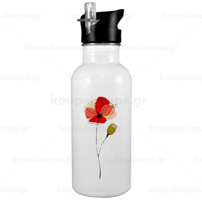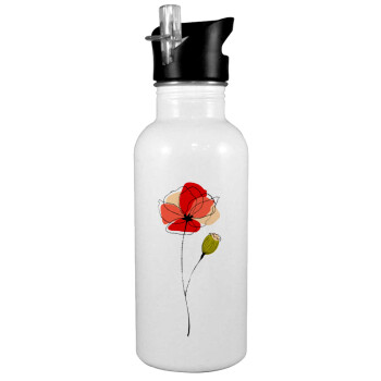 Red poppy flowers papaver, White water bottle with straw, stainless steel 600ml