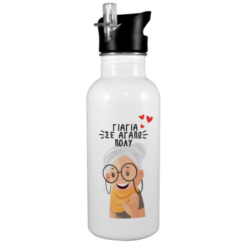 Γιαγιά σε αγαπώ πολύ!, White water bottle with straw, stainless steel 600ml