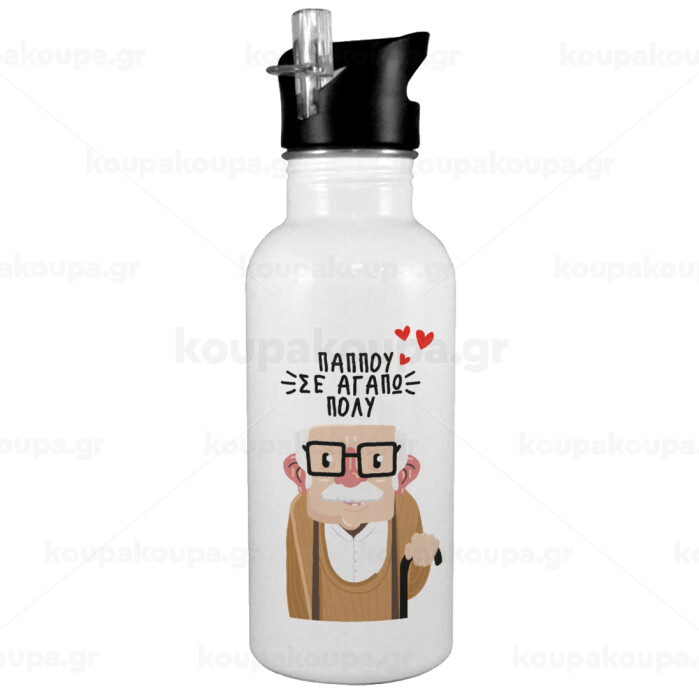 Παππού σε αγαπώ πολύ!, White water bottle with straw, stainless steel 600ml