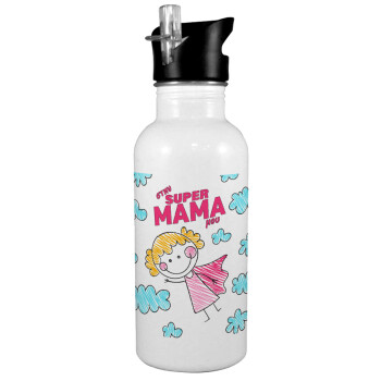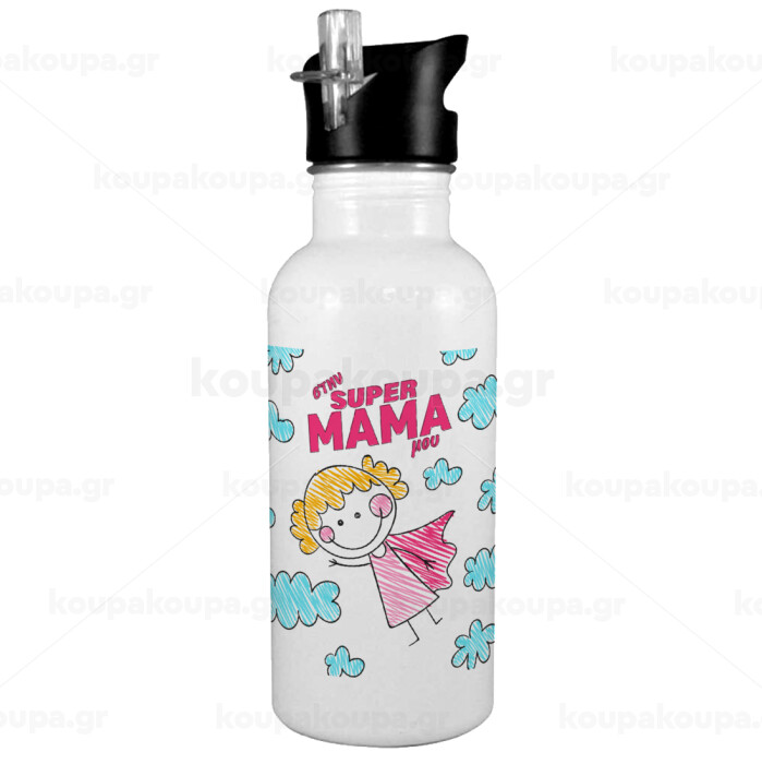 Στην SUPER μαμά μου, comic, White water bottle with straw, stainless steel 600ml