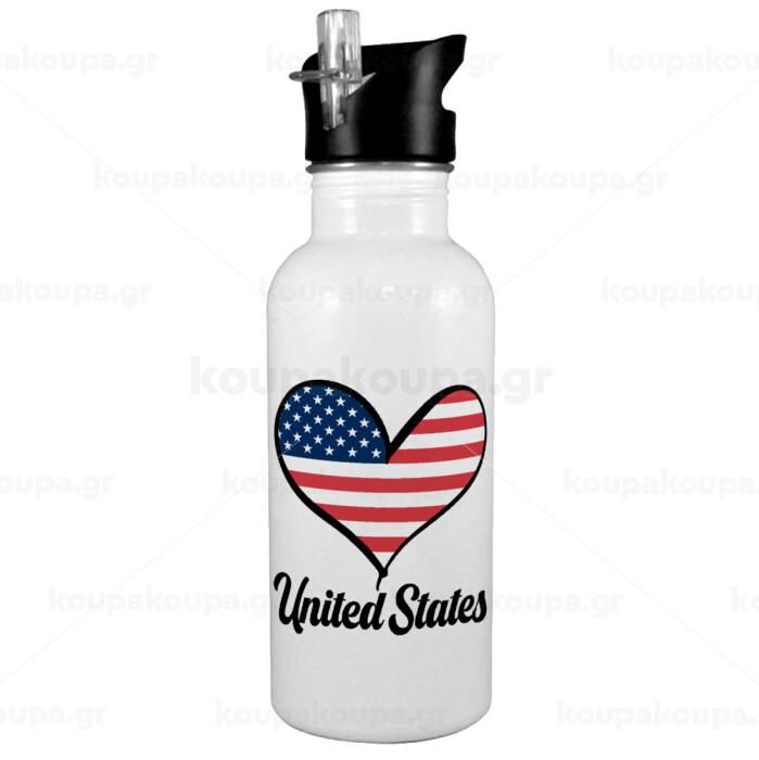 USA flag, White water bottle with straw, stainless steel 600ml