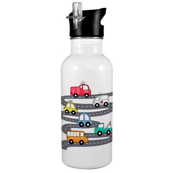 Hand drawn childish set with cars, White water bottle with straw, stainless steel 600ml