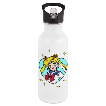 Sailor Moon star, White water bottle with straw, stainless steel 600ml