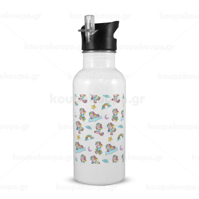 Unicorn pattern, White water bottle with straw, stainless steel 600ml
