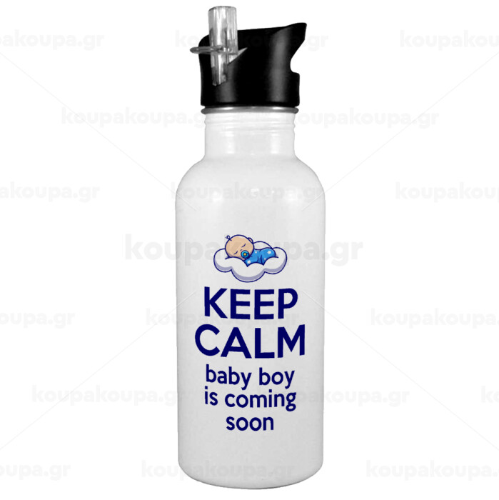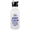 KEEP CALM baby boy is coming soon!!!, White water bottle with straw, stainless steel 600ml