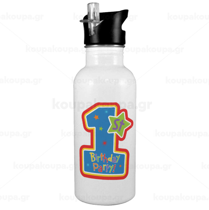Happy 1st Birthday, White water bottle with straw, stainless steel 600ml