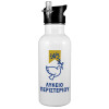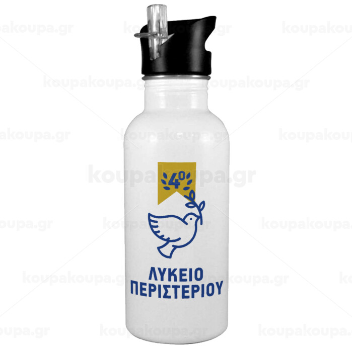 Έμβλημα Σχολικό μπλε/χρυσό περιστέρι, White water bottle with straw, stainless steel 600ml