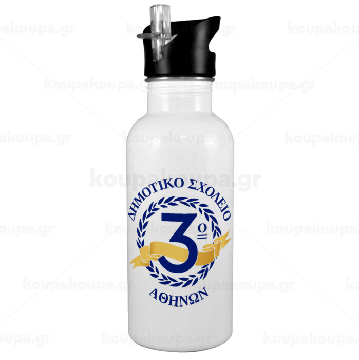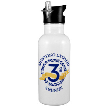 Έμβλημα Σχολικό μπλε, White water bottle with straw, stainless steel 600ml