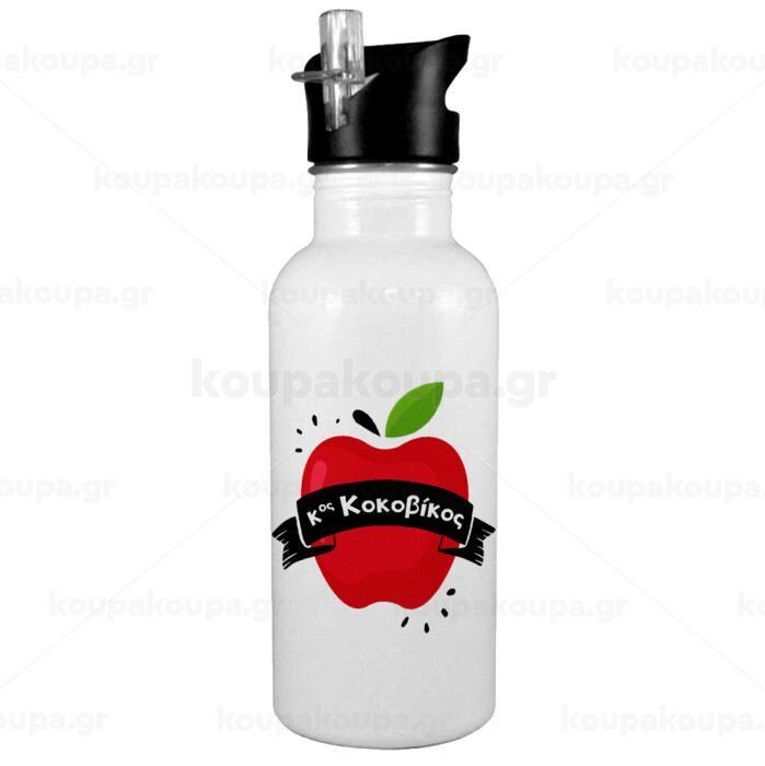 Αναμνηστικό Δώρο Δασκάλου Κόκκινο Μήλο, White water bottle with straw, stainless steel 600ml