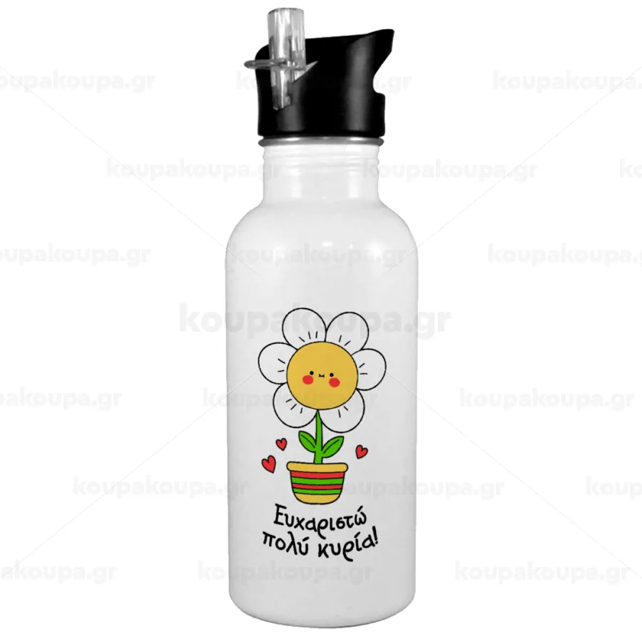 Ευχαριστώ πολύ κυρία!!!, White water bottle with straw, stainless steel 600ml