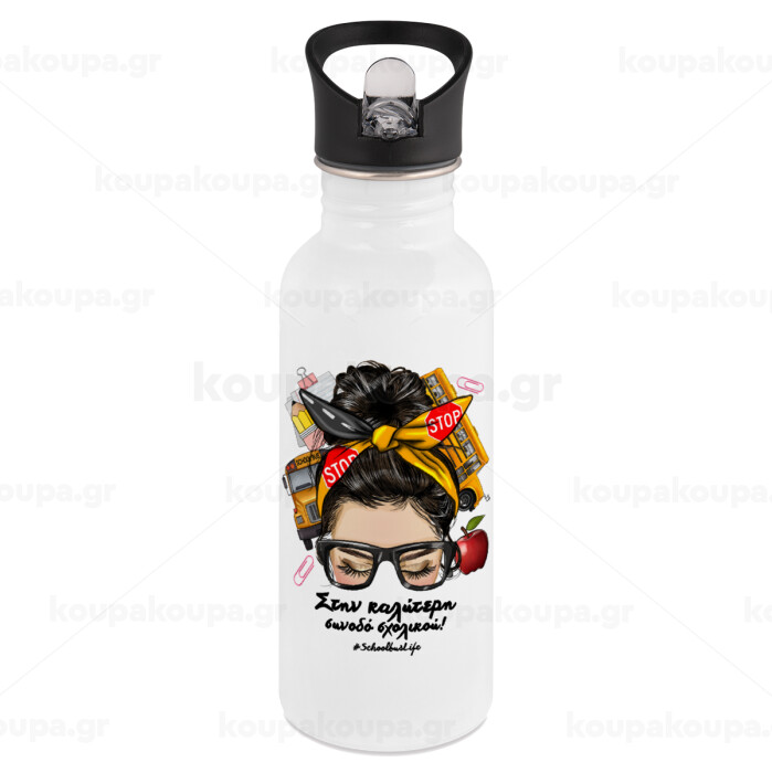 Στην καλύτερη συνοδό σχολικού!, White water bottle with straw, stainless steel 600ml